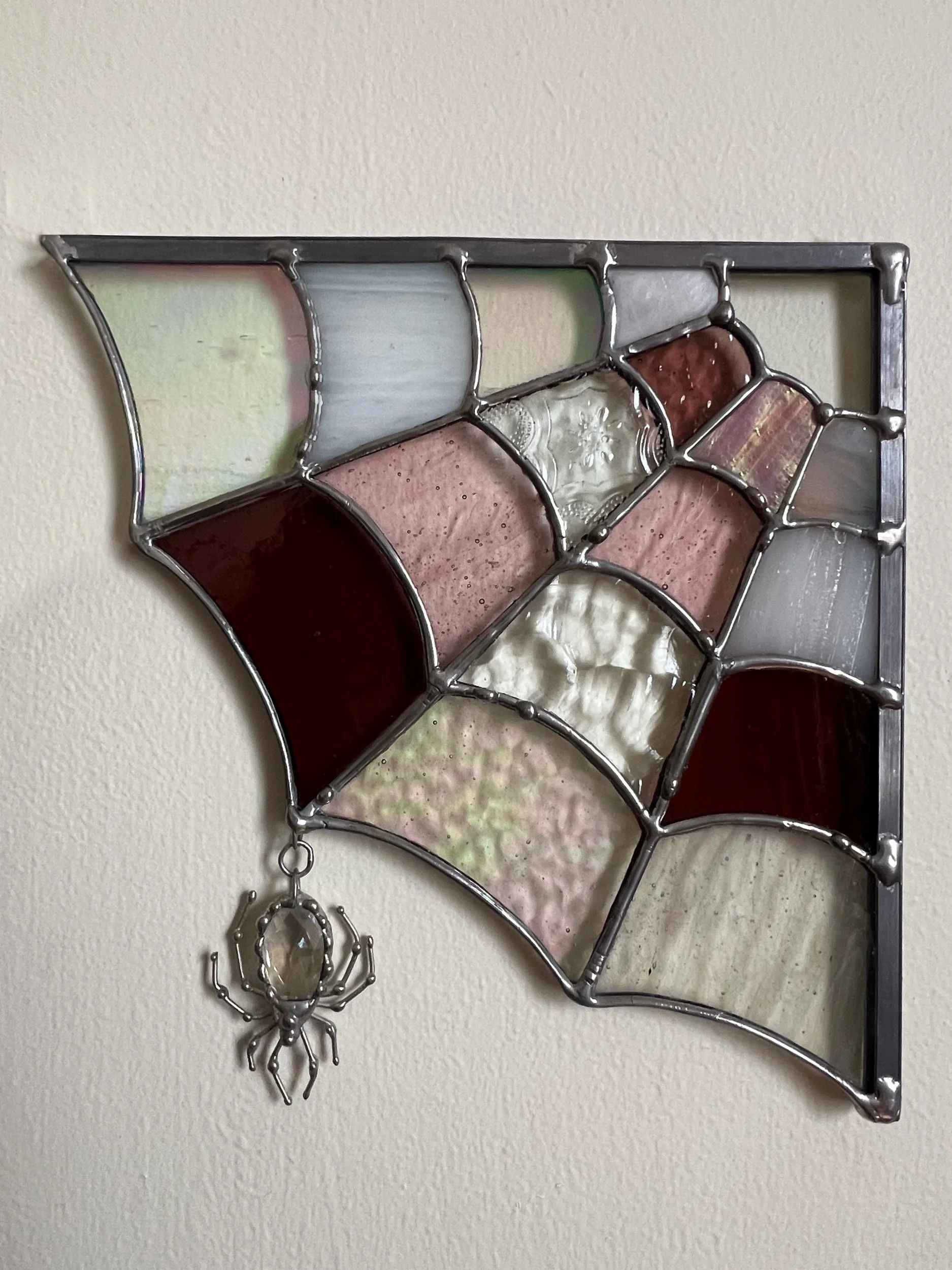 This webbed design is created to nestle into a corner. Be it a doorway or window frame, the wee spider is working hard to let the light in.